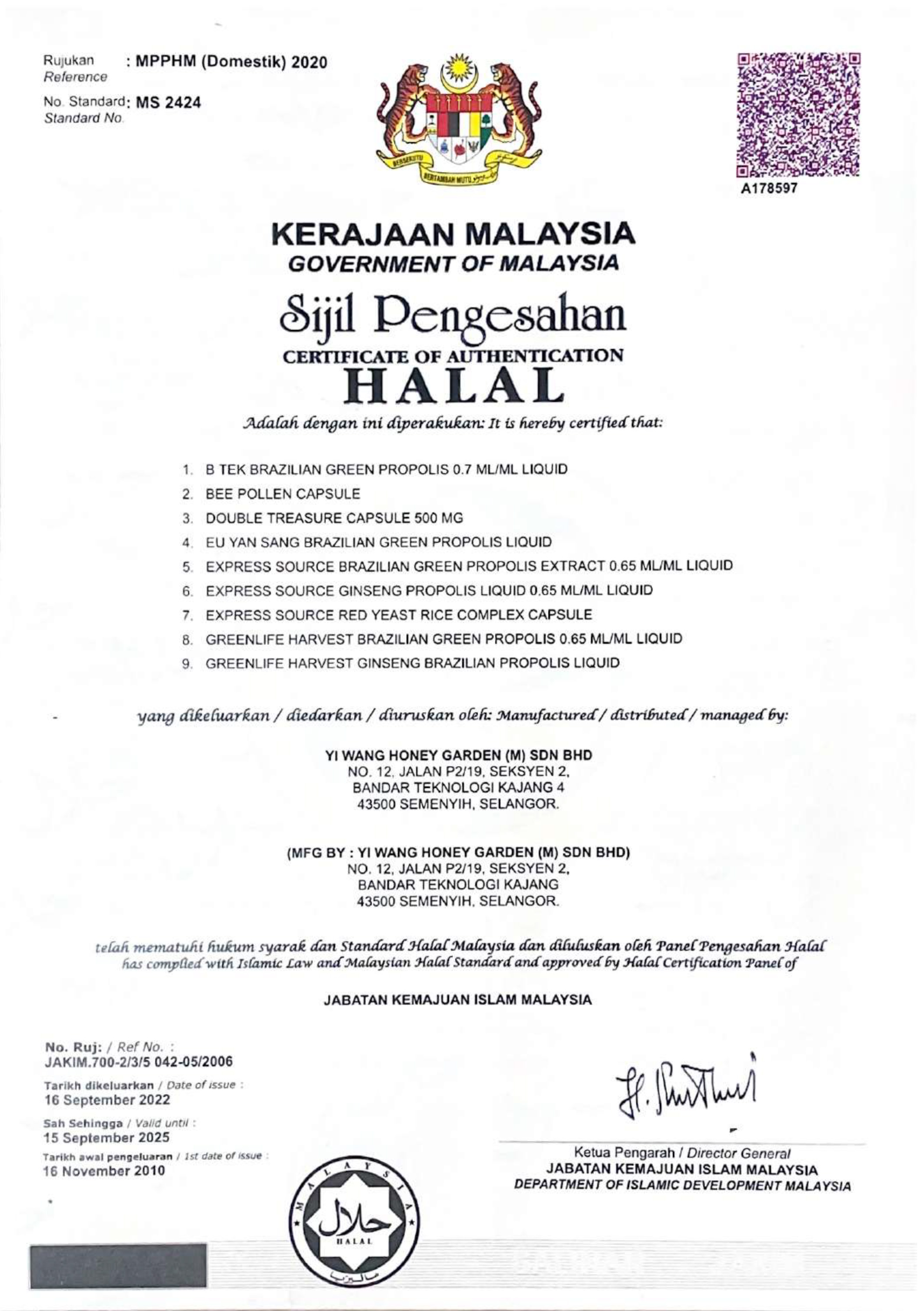 Yi Wang Honey Garden (M) Sdn. Bhd. In Malaysia is certified HALAL by JAKIM (Department of Islamic Development Malaysia), which ensure that our products are suitable for Muslim consumers and markets.