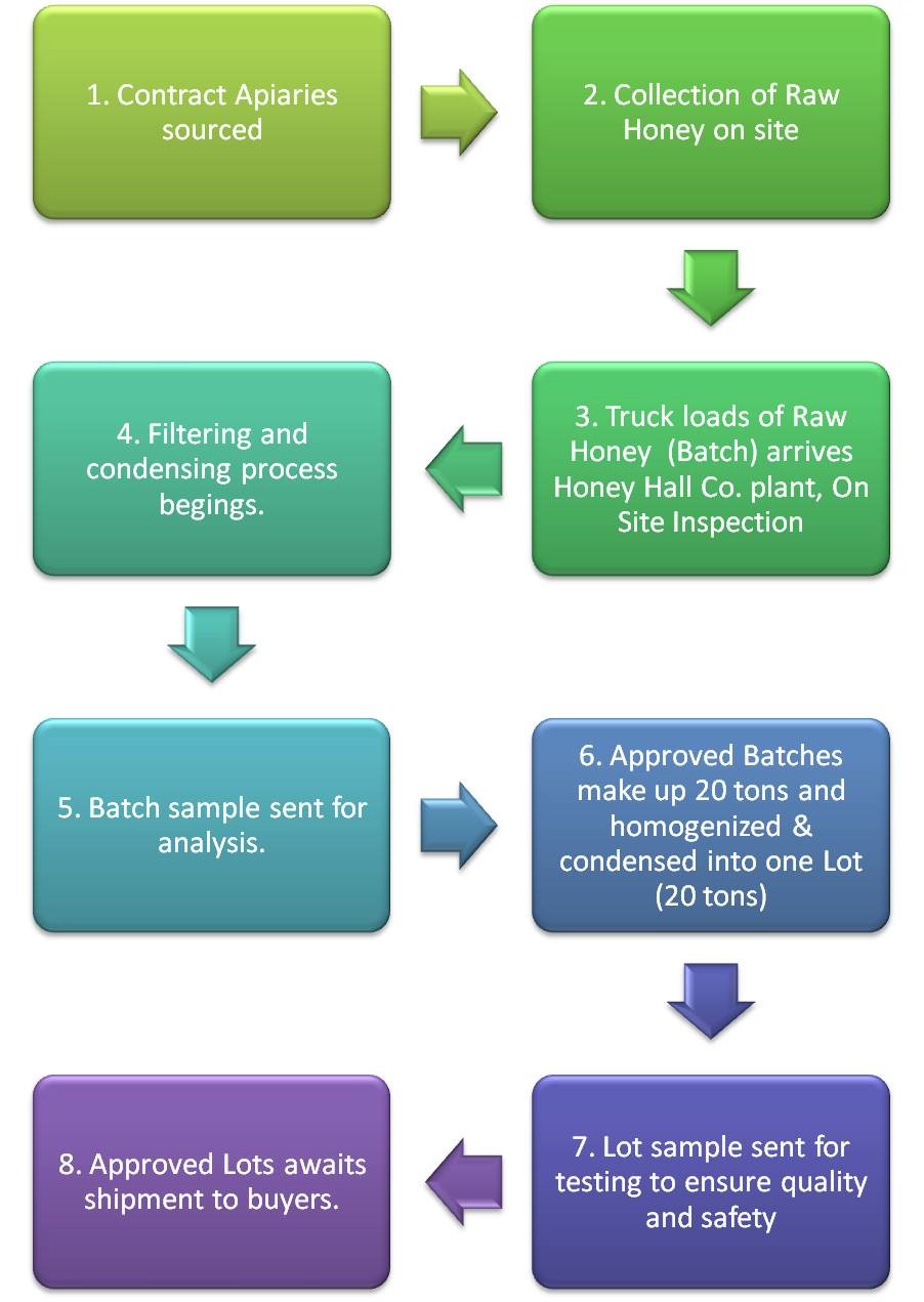 We are very aware that quality is more important than anything else in this business, that is why we devote our utmost effort to ensure that each single drum within each single batch of every lot of honey to be processed in accordance to world safety standard. Below you'll find our honey production flowchart: