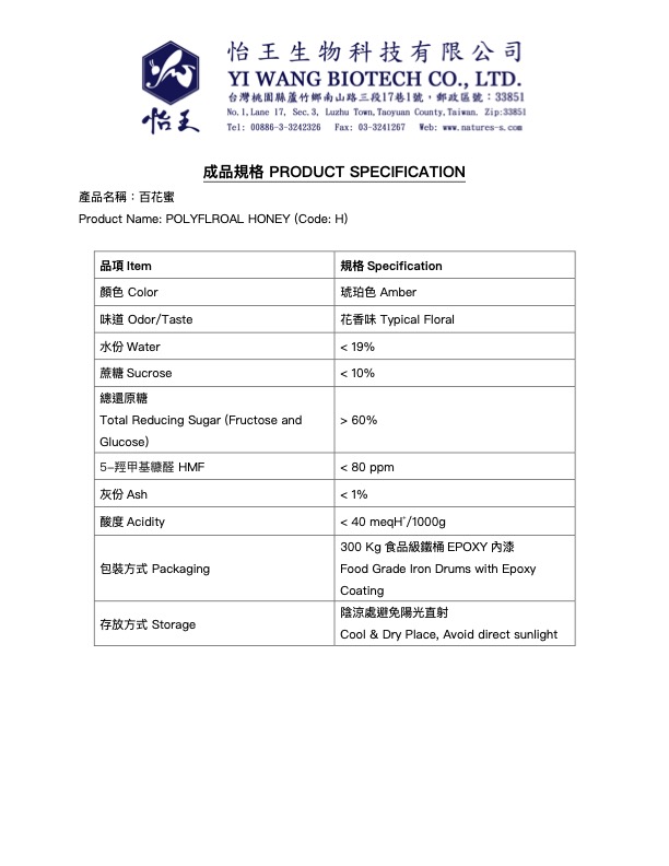 Yi Wang collects, processes, and exports pure natural honey in bulk from plants located in Taiwan and Vietnam