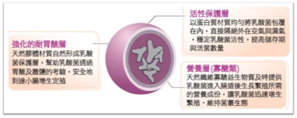 針對益生菌所開發之技術,將益生菌包袱在二層膠原蛋白以及大豆蛋白的保護膜之下,以防止益生菌被人體胃酸的高酸性以及高熱破壞,讓益生菌安全到達腸道並順利繁殖。